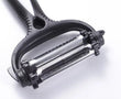 O Descascador Multifuncional possui três funções em um único utensílio: a lâmina central é perfeita para descascar, a lâmina serrilhada é ideal para cortar superfícies mais duras e a ponta afiada permite remover facilmente imperfeições e olhos de batata.